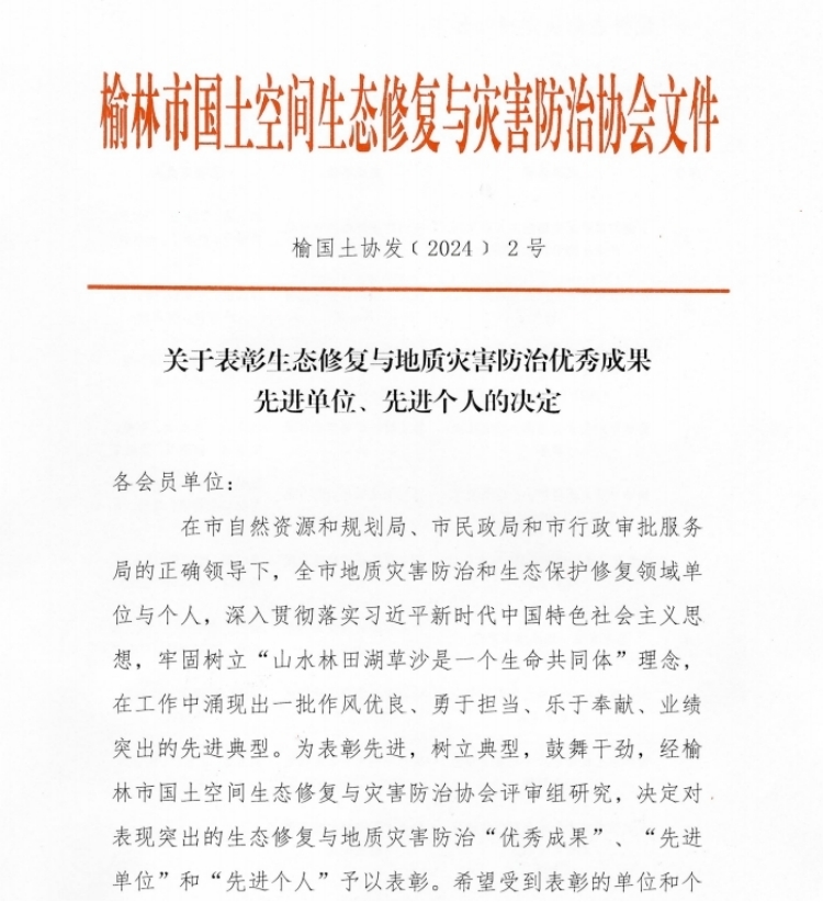 陜西工勘院爭當綠色發(fā)展先行者,作為榆林市國土空間生態(tài)修復與災害防治協(xié)會理事單位,自入會以來,公司堅持綠色低碳發(fā)展底色,持續(xù)加大在榆礦山地質(zhì)環(huán)境保護、生態(tài)環(huán)境修復、土地利用規(guī)劃等領域的市場開拓力度,派駐技術隊伍長期扎根榆林地區(qū),已累計承接生態(tài)修復與地質(zhì)災害防治相關業(yè)務近百余項,為公司下一步繼續(xù)深耕榆林市場夯實了基礎,也為公司產(chǎn)業(yè)升級構筑了新競爭優(yōu)勢、贏得了發(fā)展主動權。